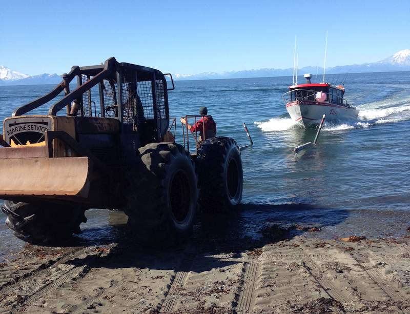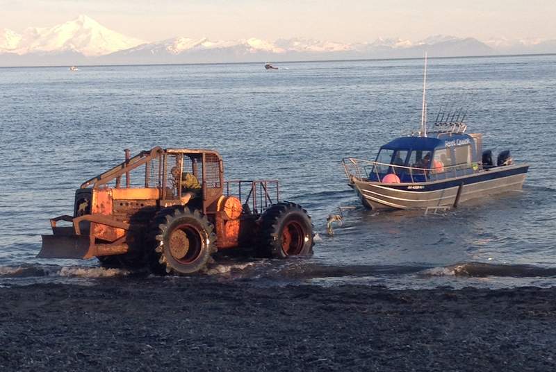During the 1980's, a handful of us ventured out into central Cook Inlet in search of halibut and salmon. There are no docks or ramps in Ninilchik, but a stretch of beach just south of town near Deep Creek provided a means to launch and retrieve a small boat. Someone came up with the idea that a tractor could be used on the beach instead of old pick-up trucks, and the charter industry blossomed. In time, larger tractors were brought in that could launch and retrieve larger boats and the industry grew. The fishing in this part of the inlet is so incredible that tourism grew and everyone wanted to fish out of Ninilchik!