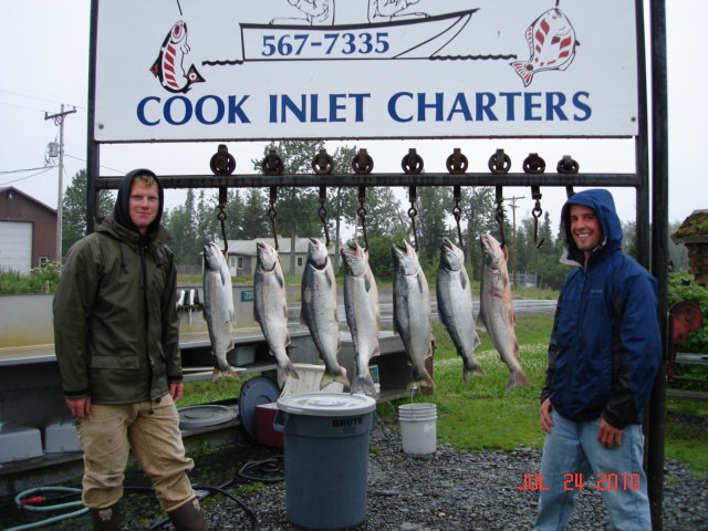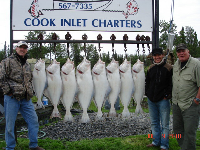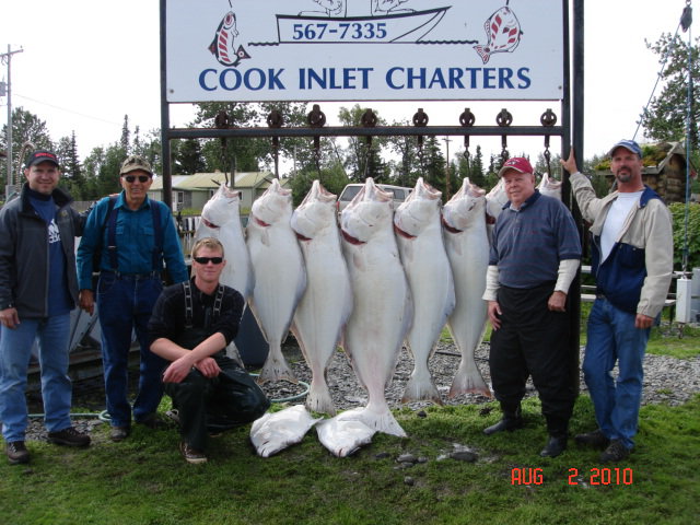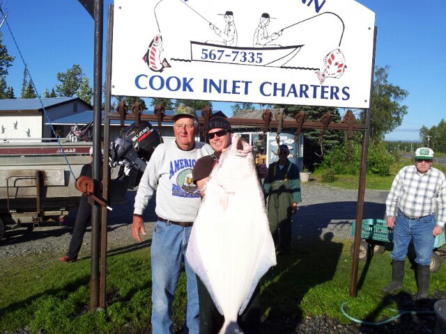"We wanted to take a moment to thank you for an amazing day on the Cook Inlet. Garrett has to be one of the hardest working (and young) guides in Alaska! Being fisherman we really appreciated that he got us involved immediately in the hooking and landing of fish. We were fortunate to get a couple of big ones (175 and 56 pounders) in the deeper water and number of nice eating size Halibut in the shallower water. Garrett encouraged us to try several techniques, our favorite was jigging with the lighter weight rods. We were also fortunate to have Mitchell along as mate which really helped in getting the big one in the boat! It was our first time fishing for Halibut and despite comments from some anglers who claim it is no different than pulling an anchor off the bottom these fish can put up a serious fight! Thanks again to everyone."
